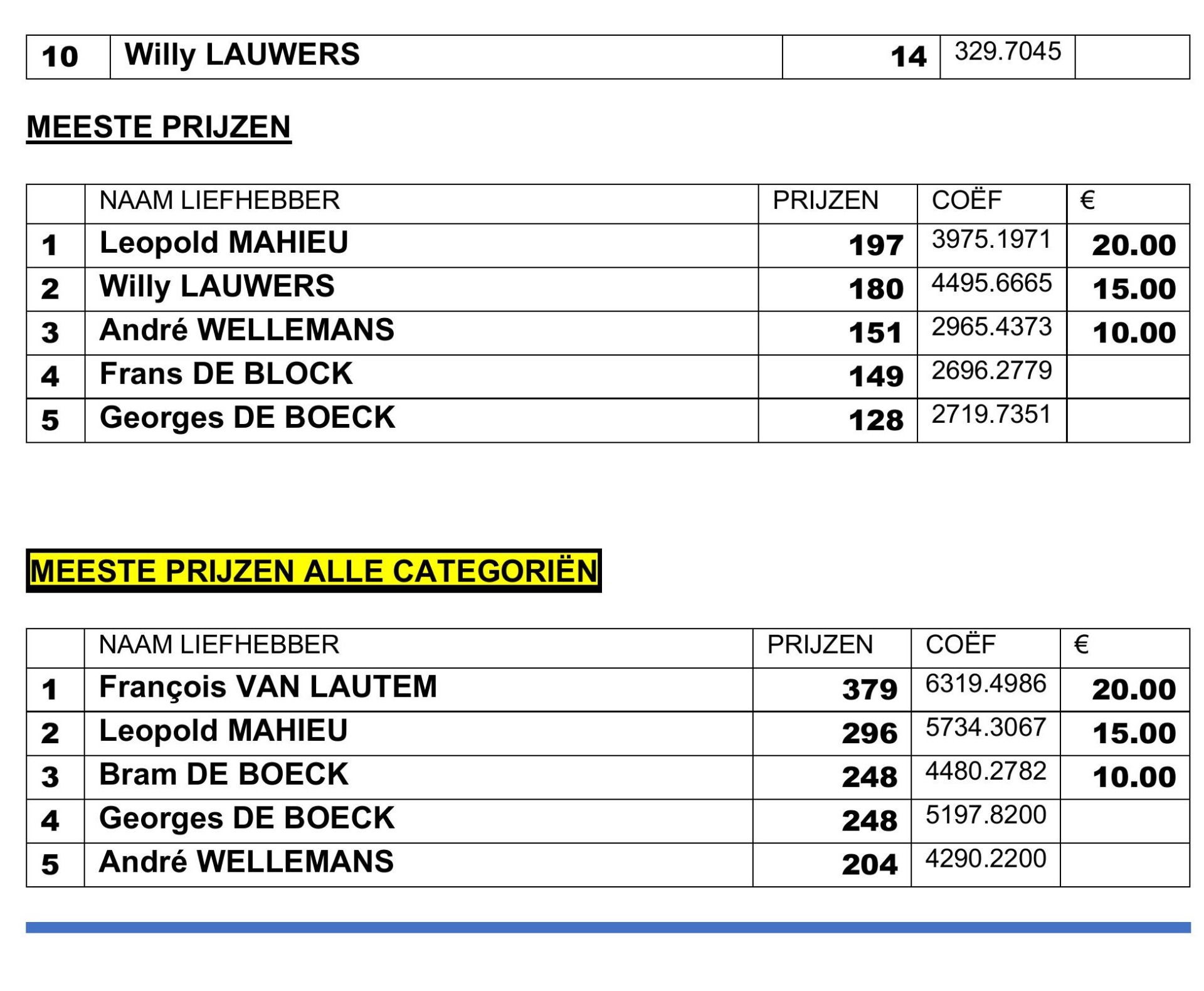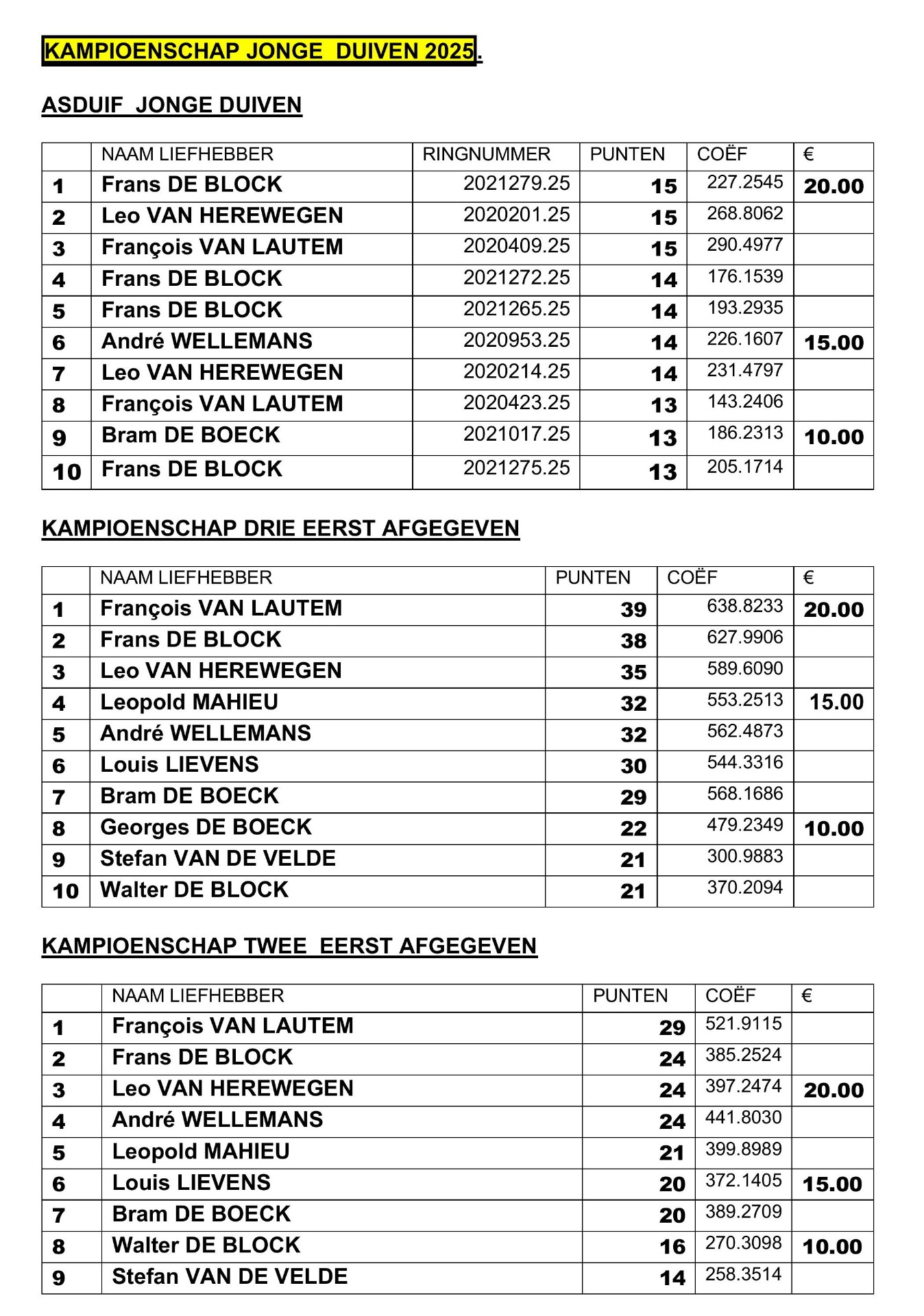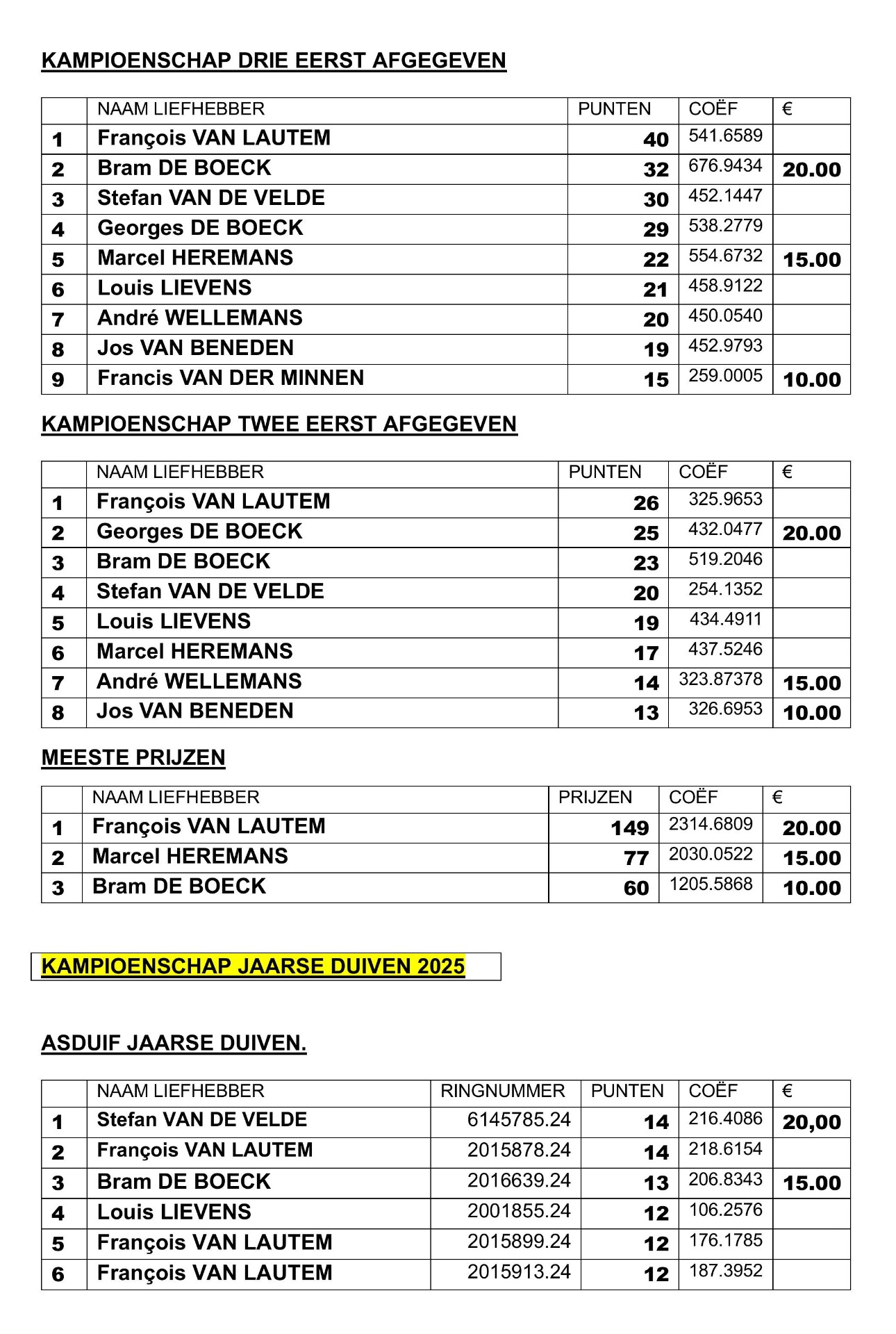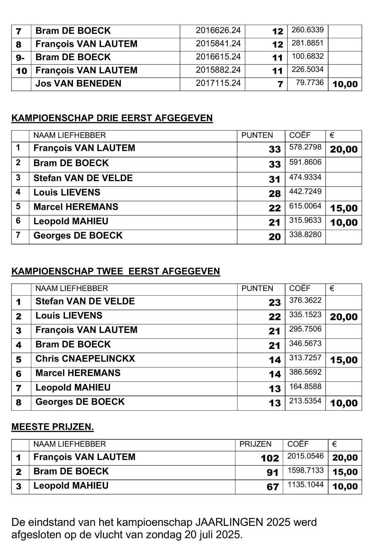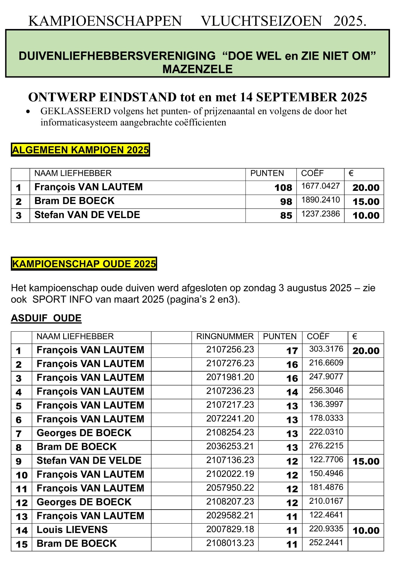 Eindstand Clubkampioenschap 2025 per 14 september 2025