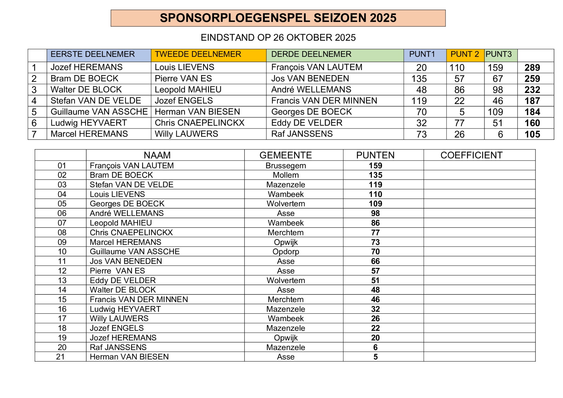 Eindstand op 26 oktober 2025